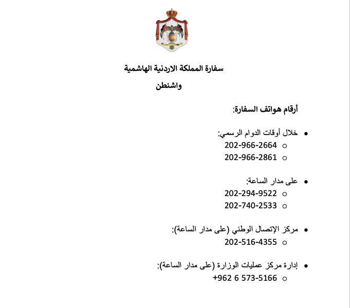 السفارة الأردنية في واشنطن تعلن ارقام الطوارئ