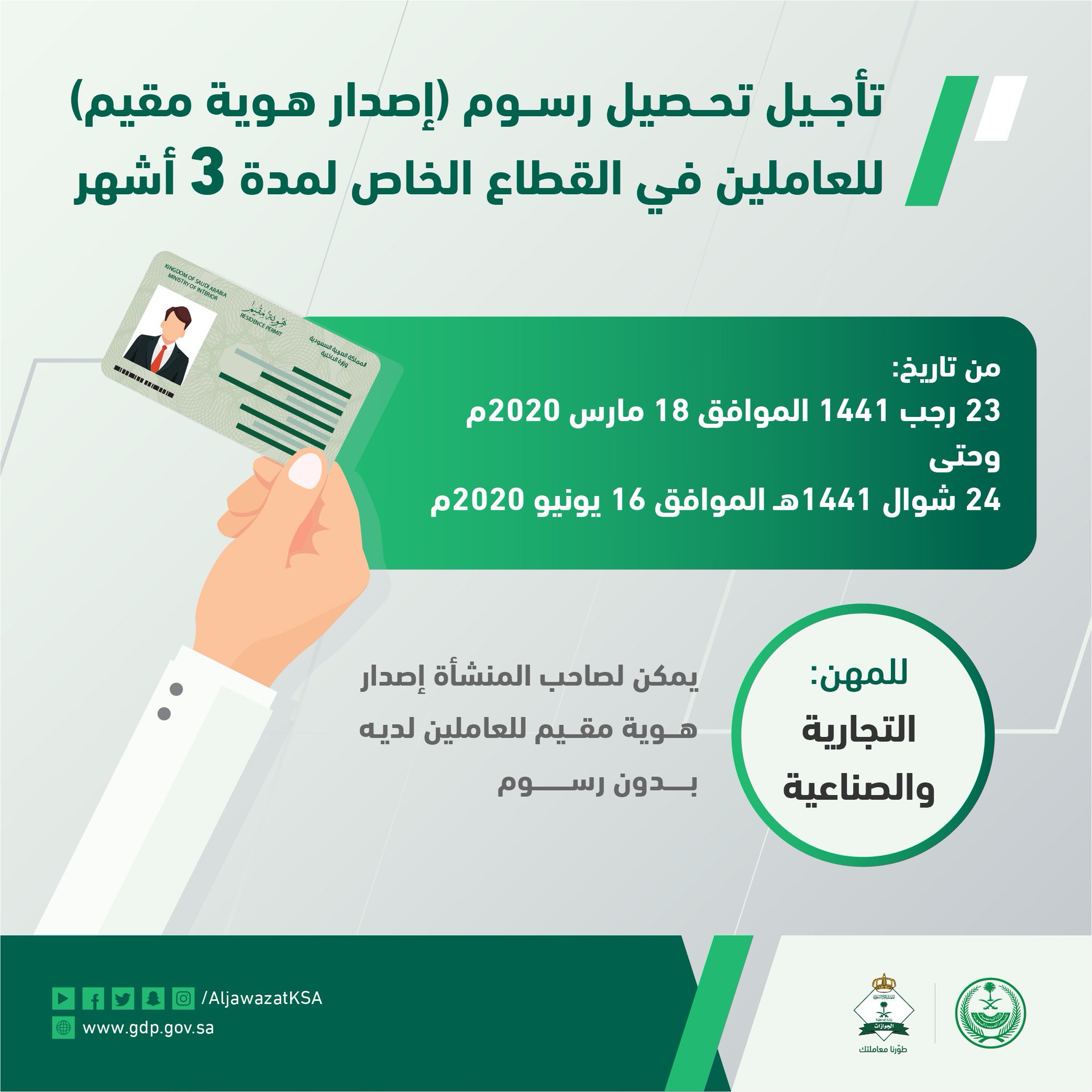 الجوازات السعودية On Twitter الجوازات السعودية تعلن تأجيل تحصيل رسوم إصدار هوية مقيم المستحقة على منشآت القطاع الخاص لمدة ثلاثة أشهر Https T Co Dr3i7o7hue كلنا مسؤول Https T Co Lfbgb9am8n