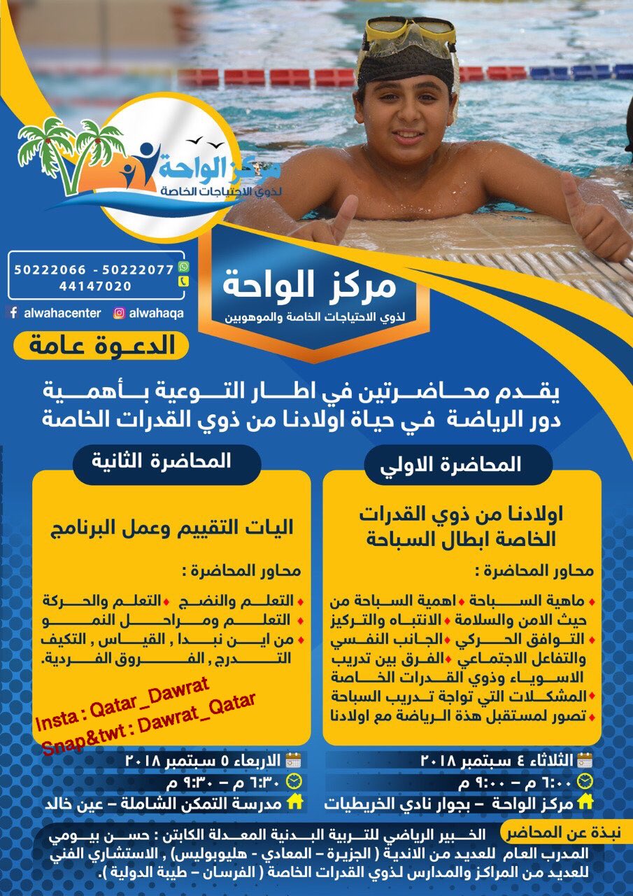 دورات قطر Auf Twitter مركز الواحة لذوي الاحتياجات الخاصة والموهوبين يقدم محاضرتين في اطار التوعية بأهمية دور الرياضة في حياة اولادنا من ذوي القدرات الخاصة الدعوة عامة ولكن يرجى التسجيل عن طريق